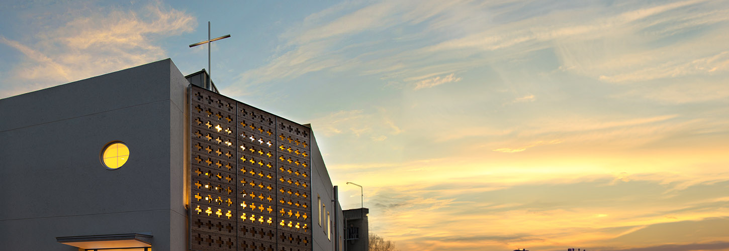 2階建ての新会堂の、1階を「地域に開かれた空間」、2階を「喧騒から守られた聖なる空間」とし、車通りの多い交差点という立地にあって、「地域に開くこと」と、「静けさと安らぎのある祈りの場」をどのようにすれば両立できるのか?という課題の解決策となる、工夫に富んだ建築デザインとなっています。